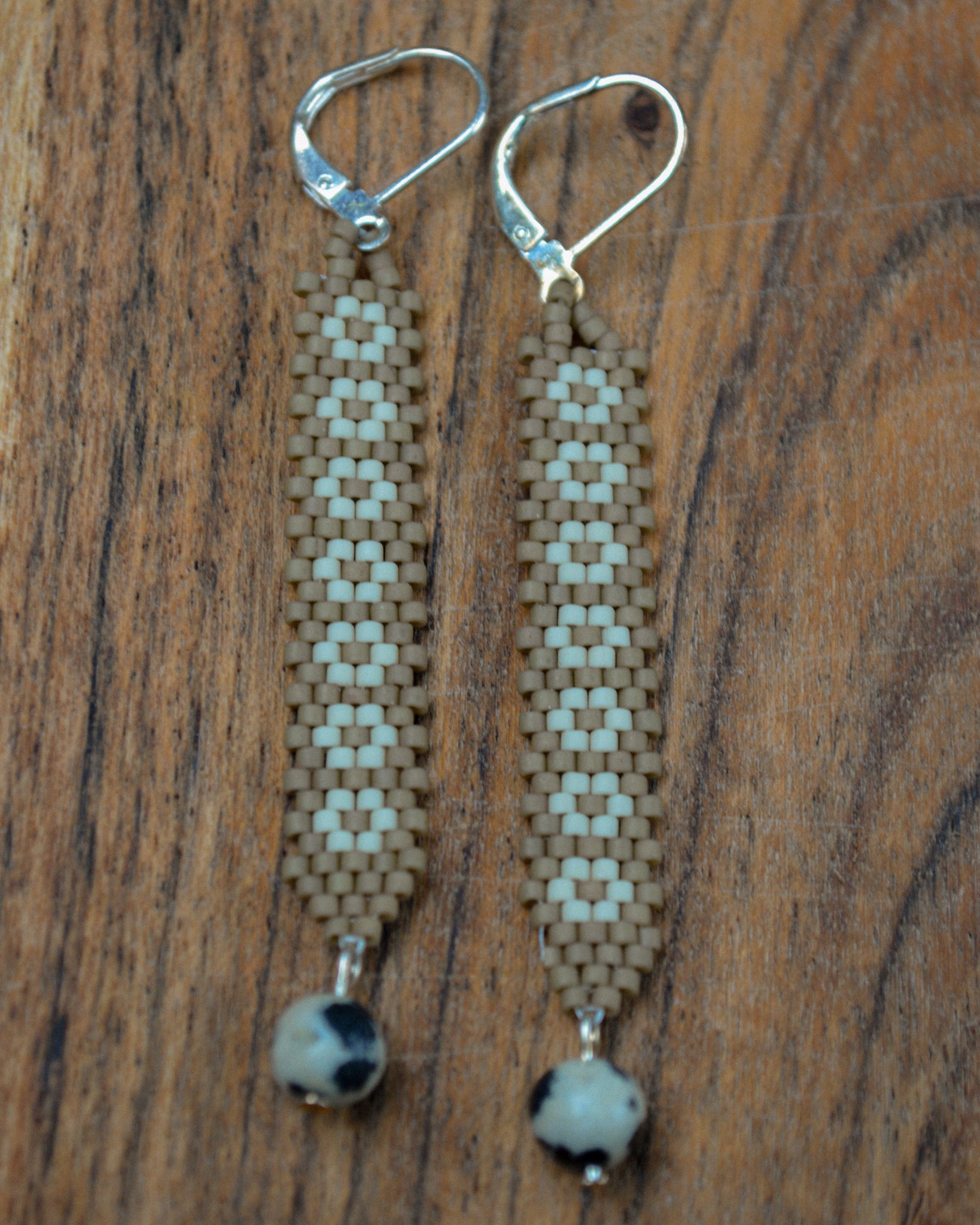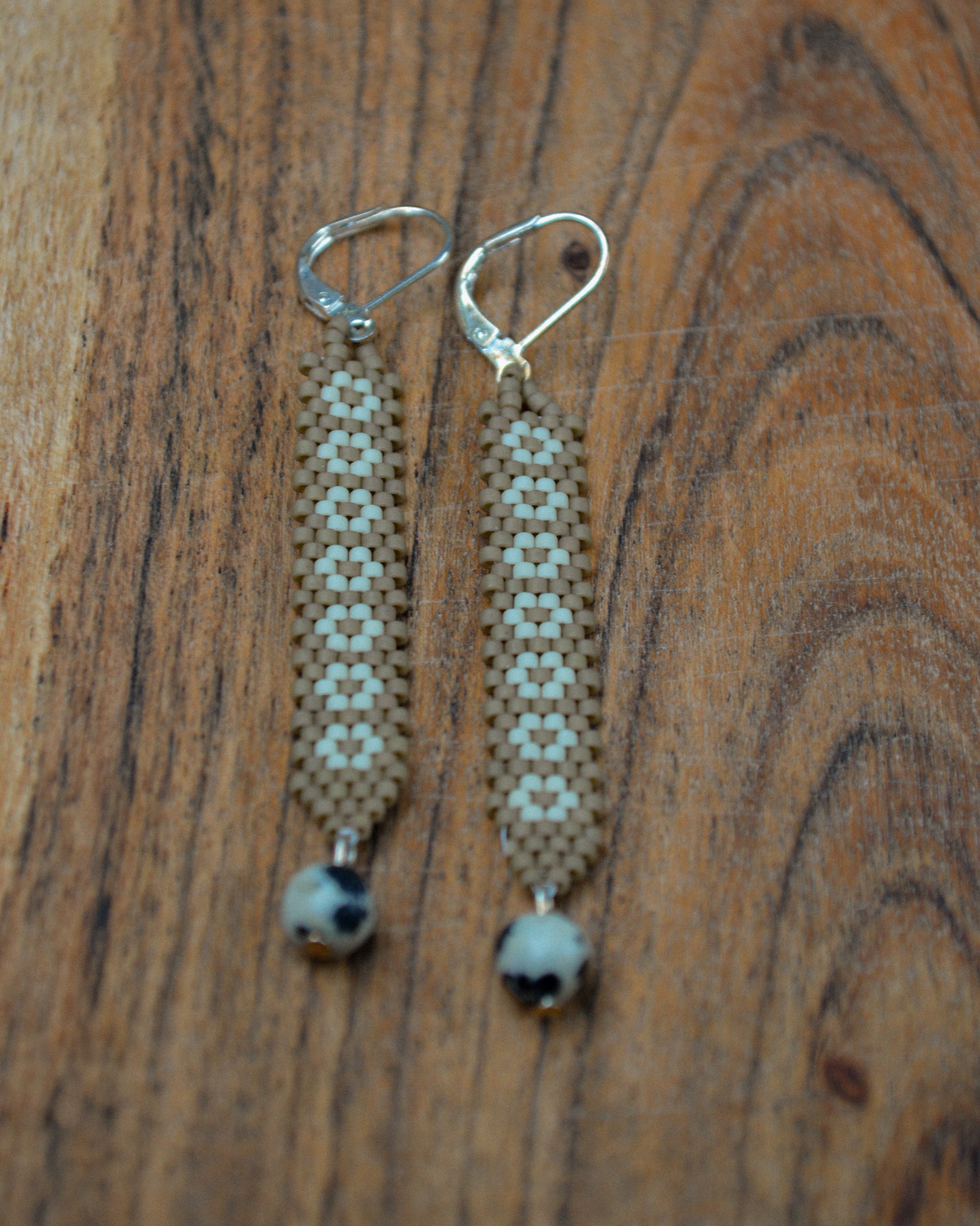 This pair features a gentle mix of sandstone beige and creamy off-white beads, woven into a subtle folk-art pattern that feels both timeless and understated. The muted palette gives them a warm, natural presence—like sun-bleached textiles, hand-spun fibers, or worn-in earth tones found on an old quilt or woven basket.